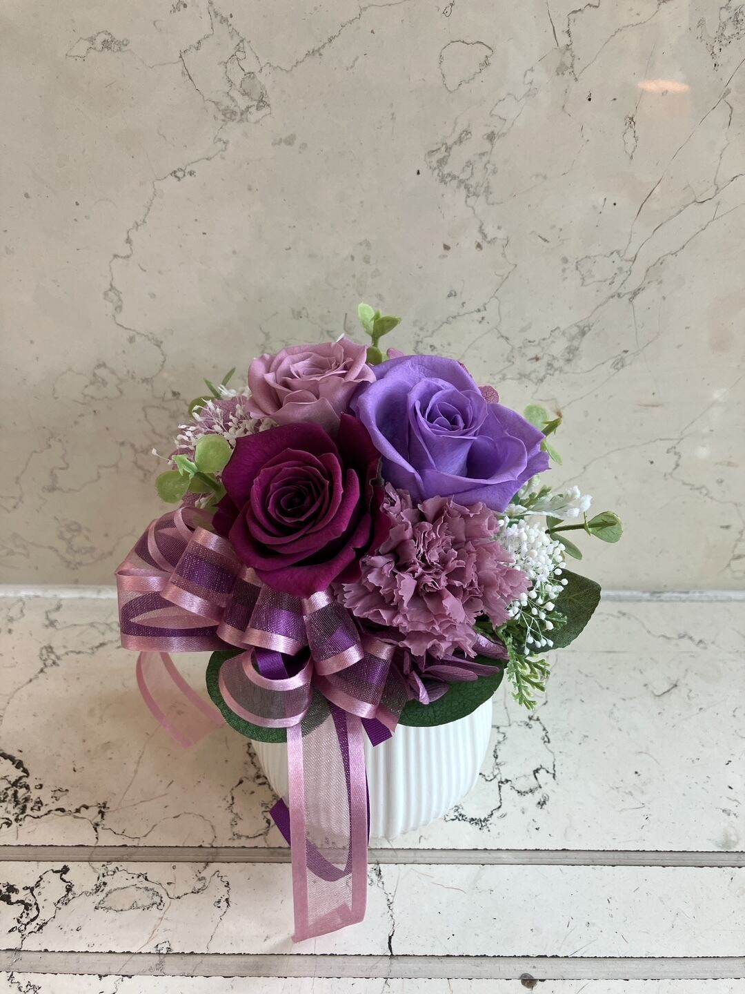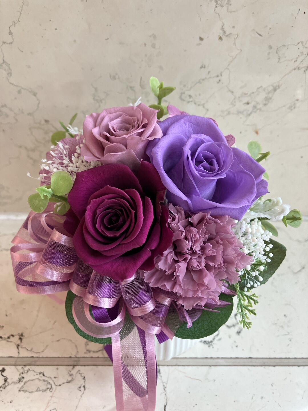 パープル系のバラやグレイッシュパープルのカーネーションを合わせた
