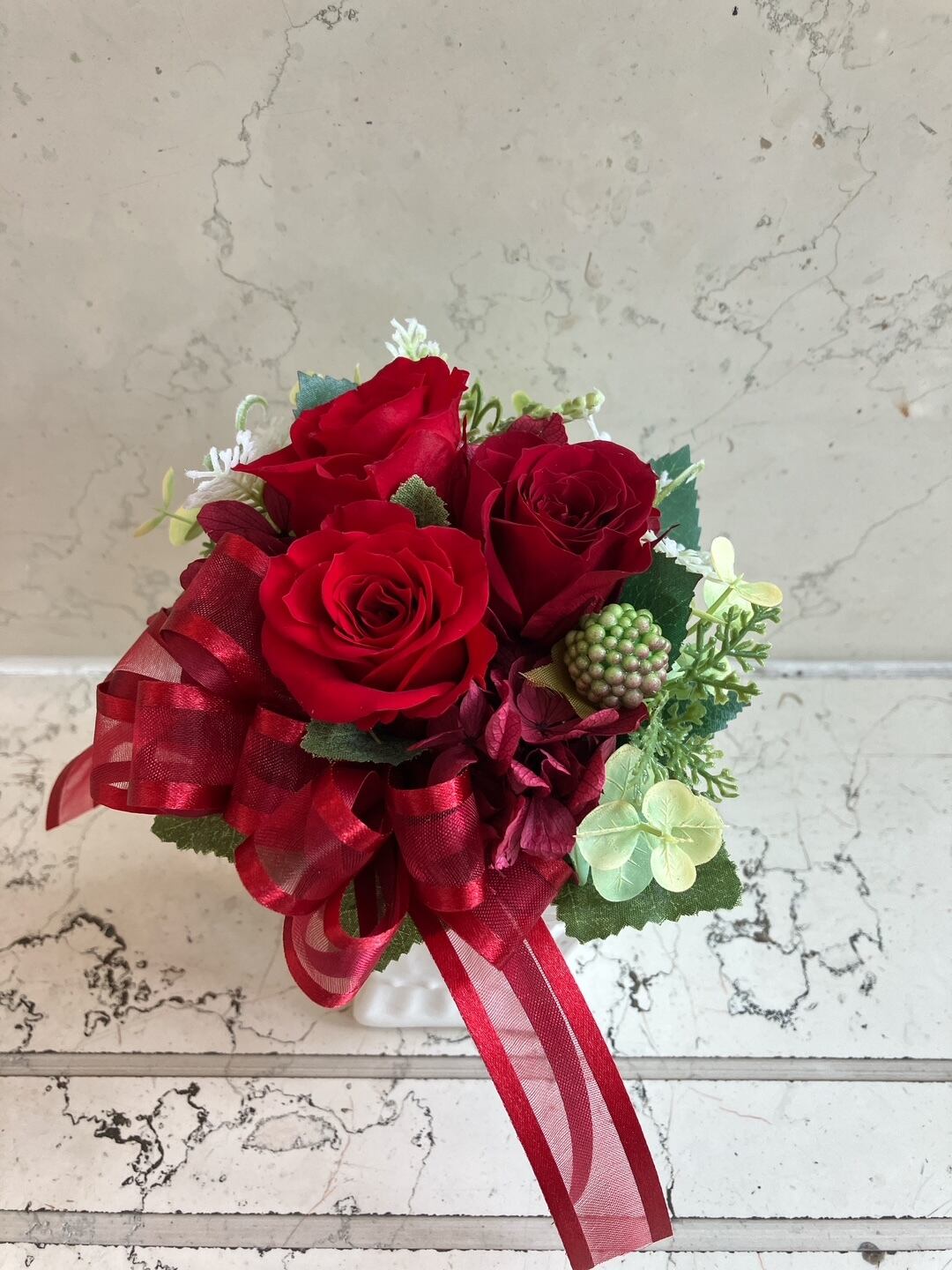 白い陶器に赤系のプリザーブドフラワーをあしらった、