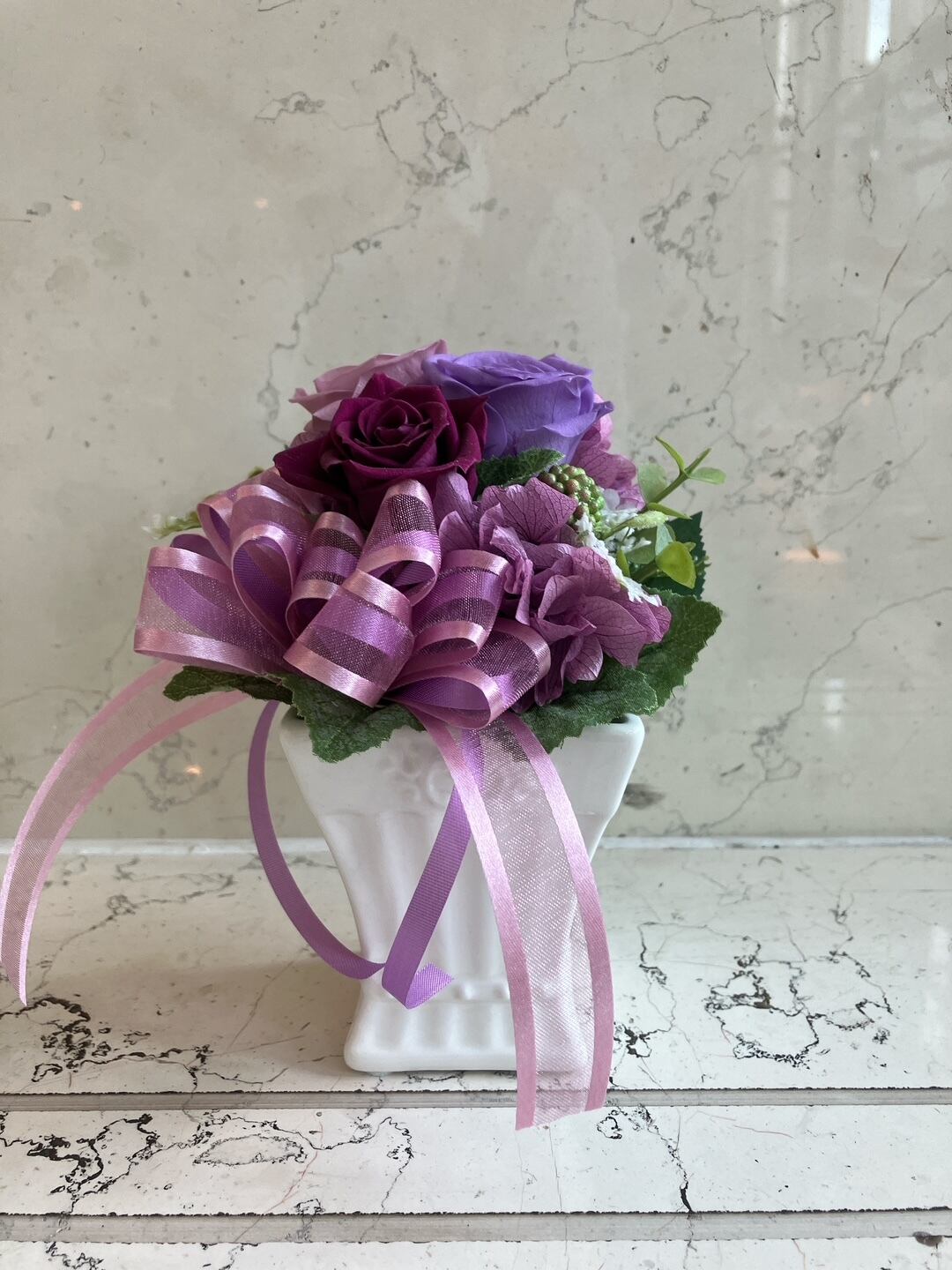 白い陶器にパープル系のプリザーブドフラワーをあしらった