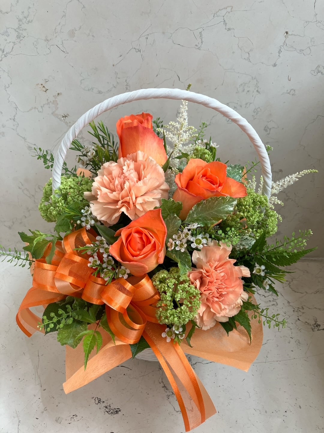 アレンジメント「ハンドル付きホワイトバスケット~オレンジ~」