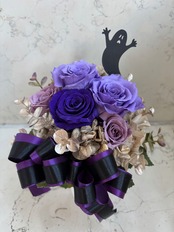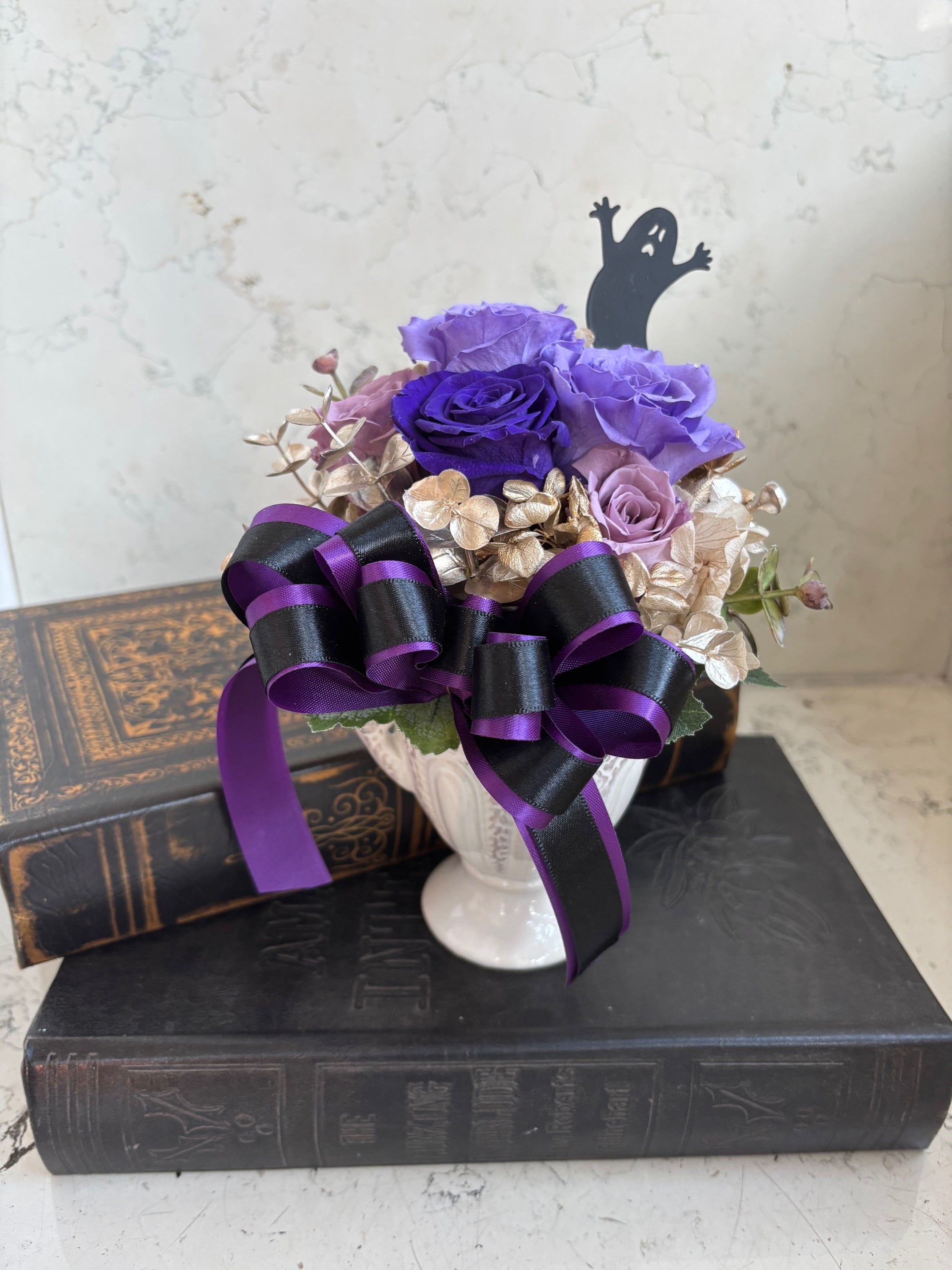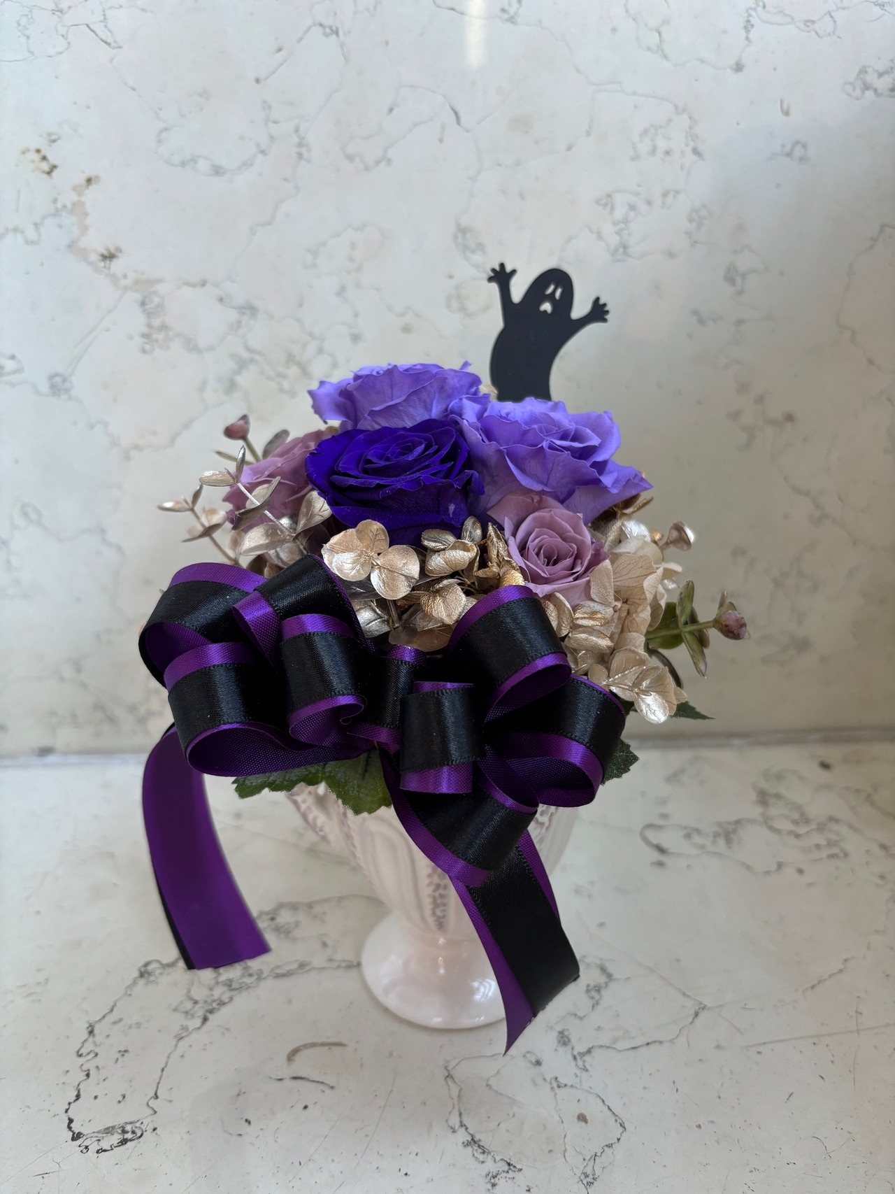 デザインのかわいらしい白の陶器にパープル系のプリザーブドフラワーをあしらった、ハロウィンアレンジメント。プレゼントにもおすすめです。