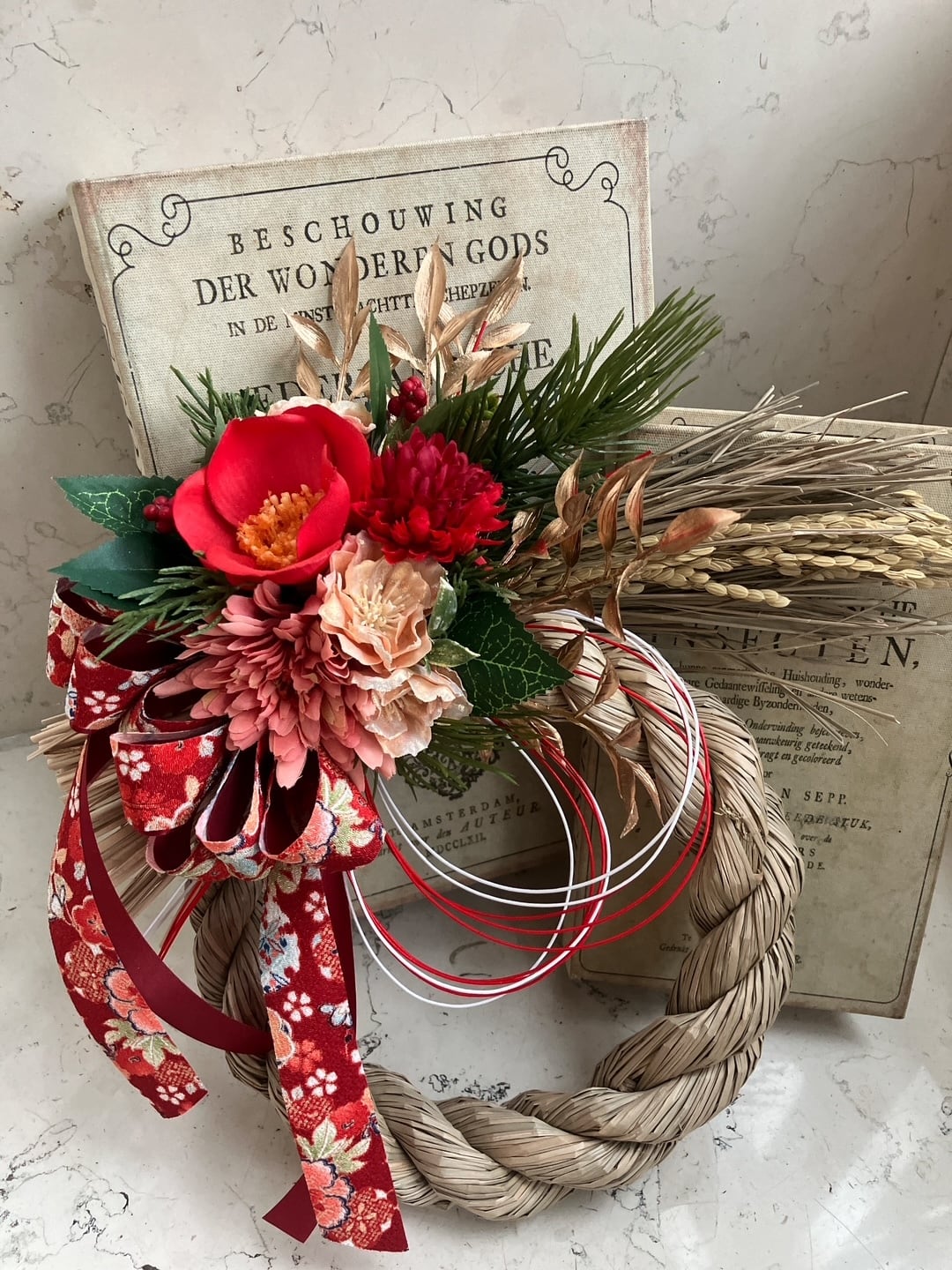 アーティフィシャルフラワー お正月しめ縄飾り「赤椿」
