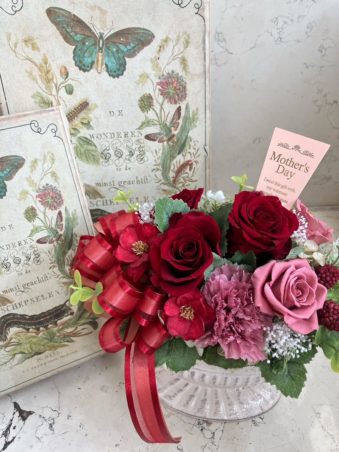 赤いバラやモーブピンクのカーネーションなど合わせてお作りしました