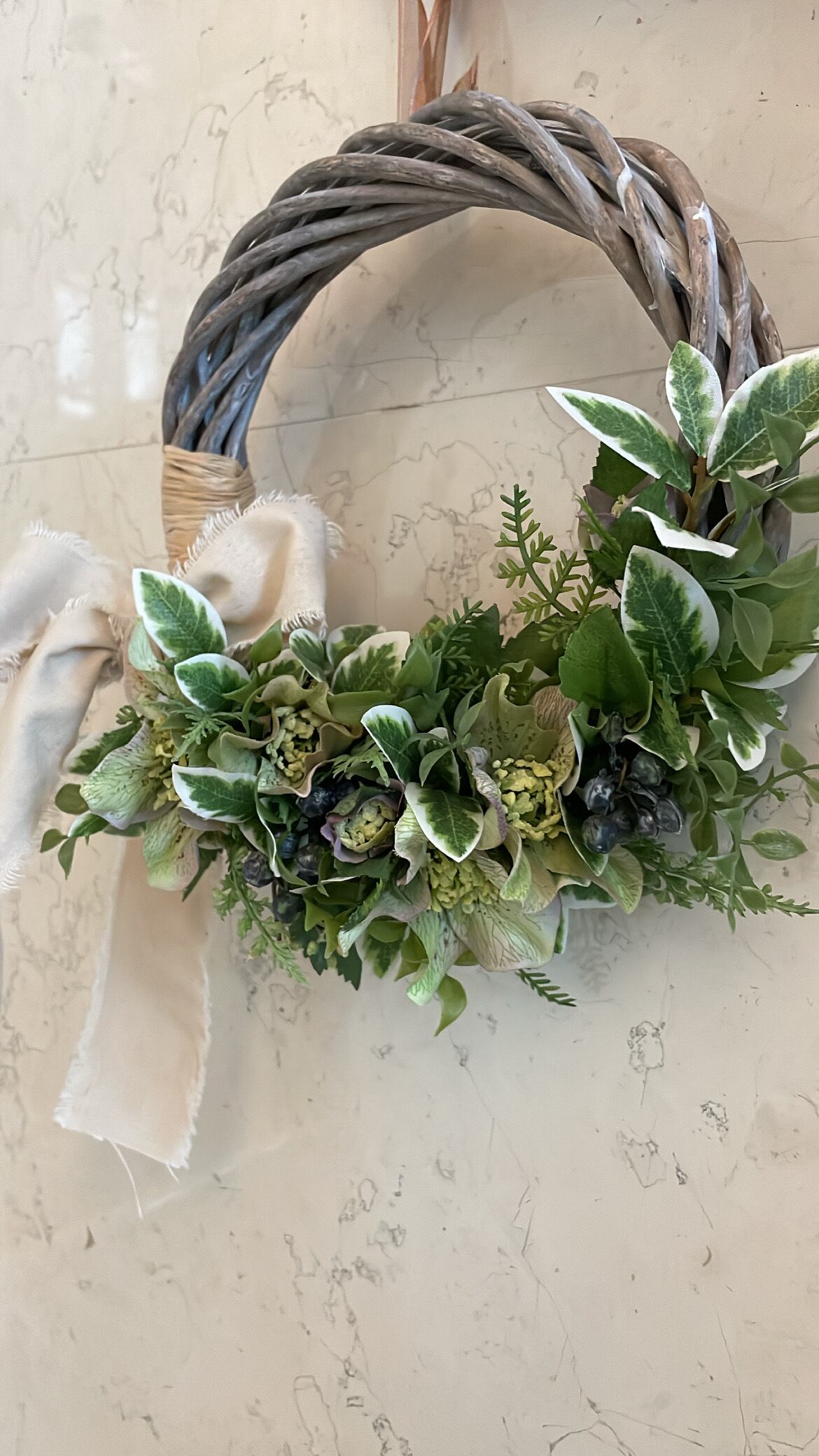 アンティークなクリスマスローズとグリーンのリース。ギフトにもご自宅用にもおすすめです。