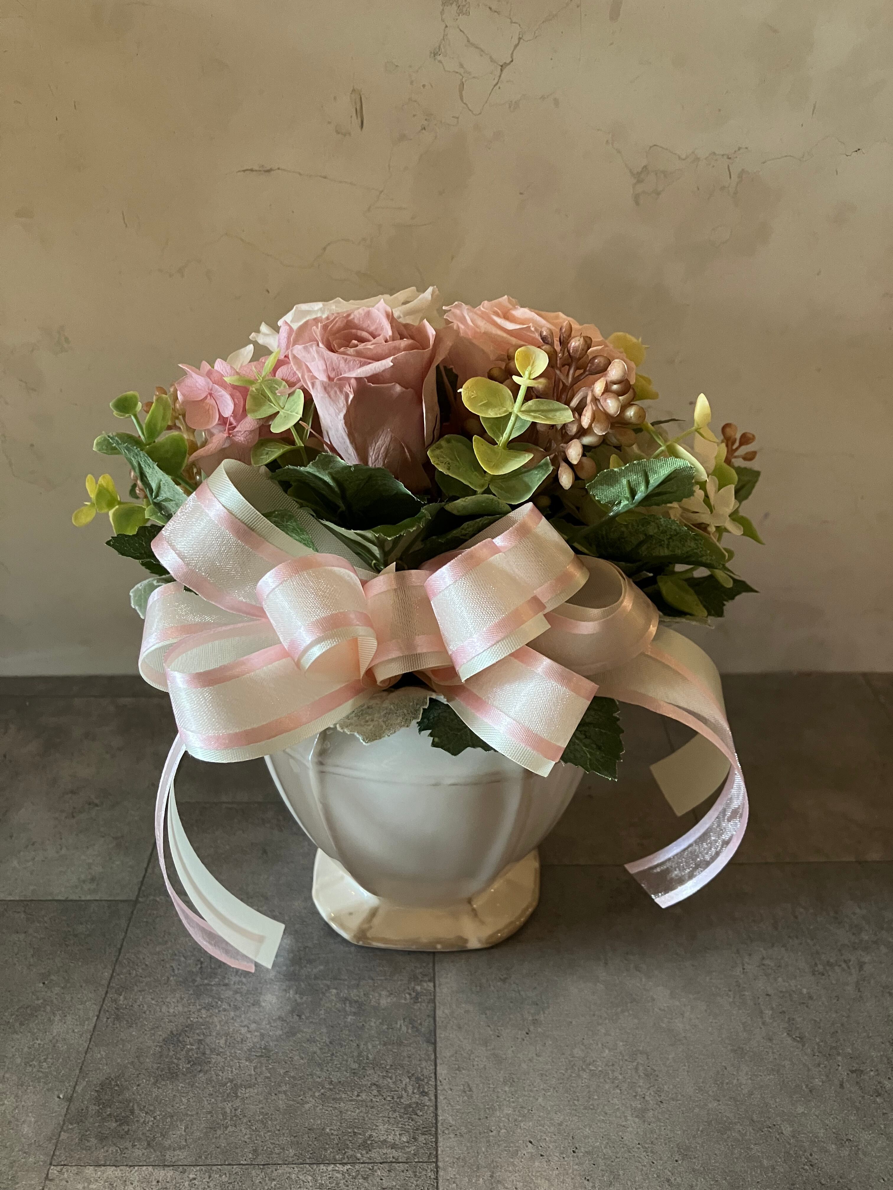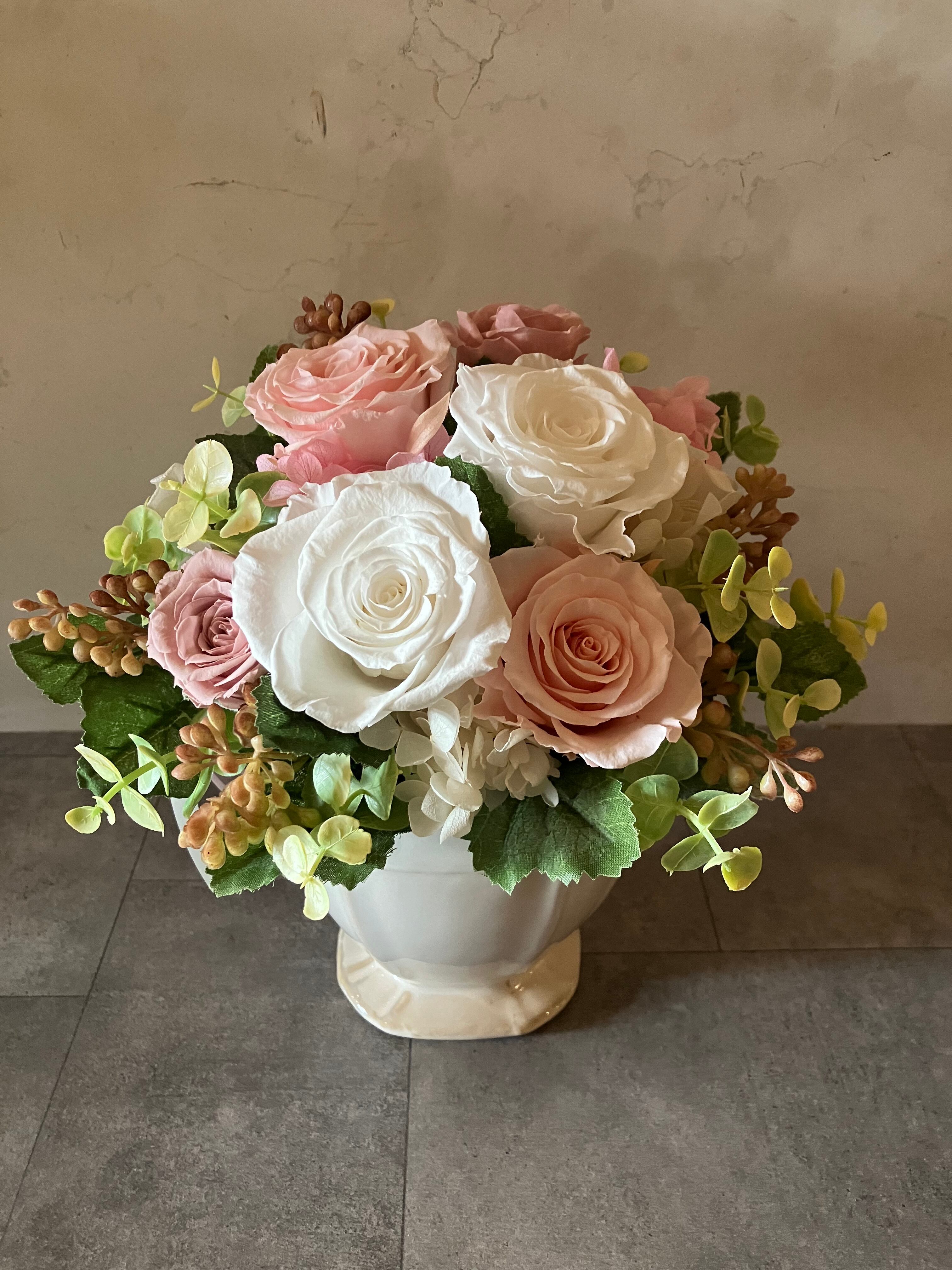 白の陶器にホワイト、ピンク系のプリザーブドフラワーをあしらった、上品なアレンジメント。プレゼントにもおすすめです。