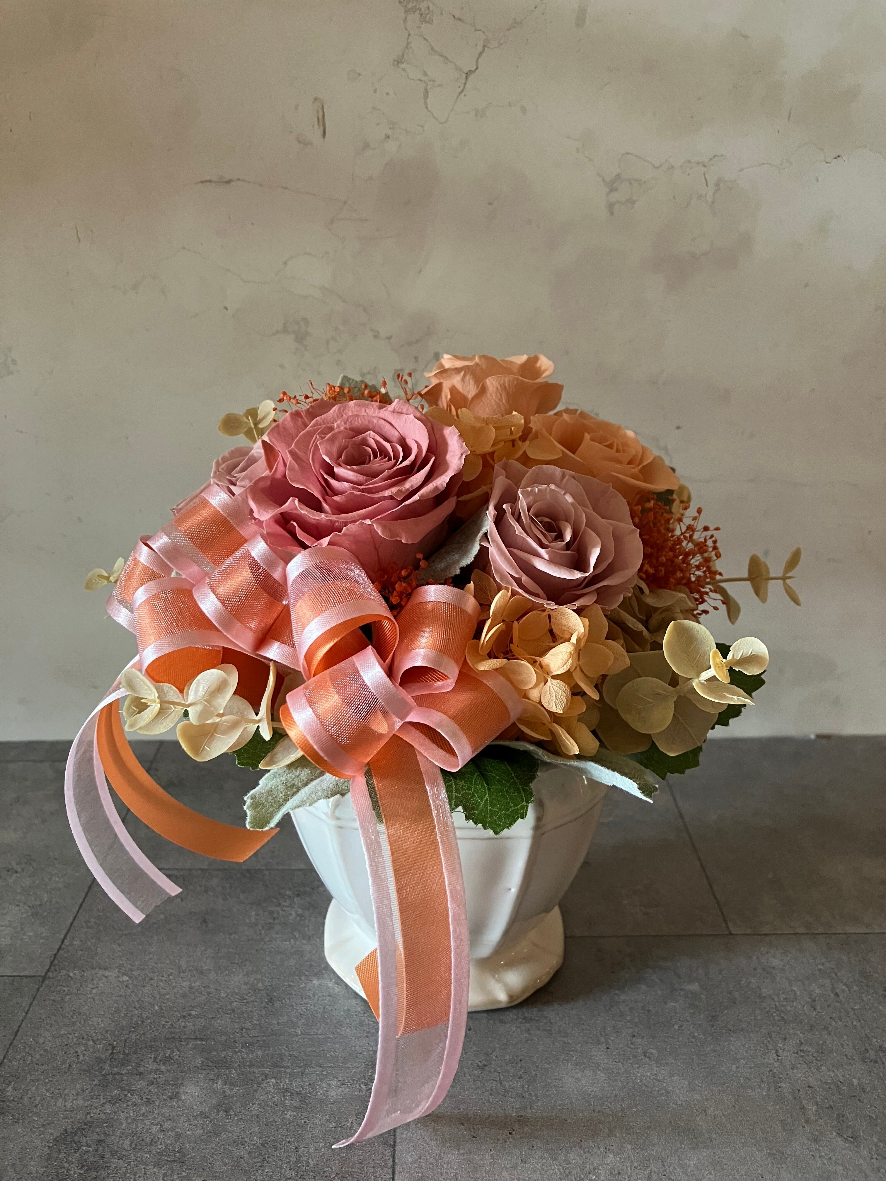 白の陶器にくすみカラーのピンク、オレンジ系のプリザーブドフラワーをあしらった、大人かわいいアレンジメント。プレゼントにもおすすめです。