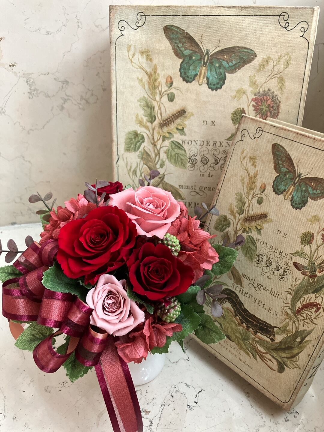 デザインのかわいらしい白の陶器に赤系のプリザーブドフラワーをあしらった、上品で華やかなアレンジメント。プレゼントにもおすすめです。