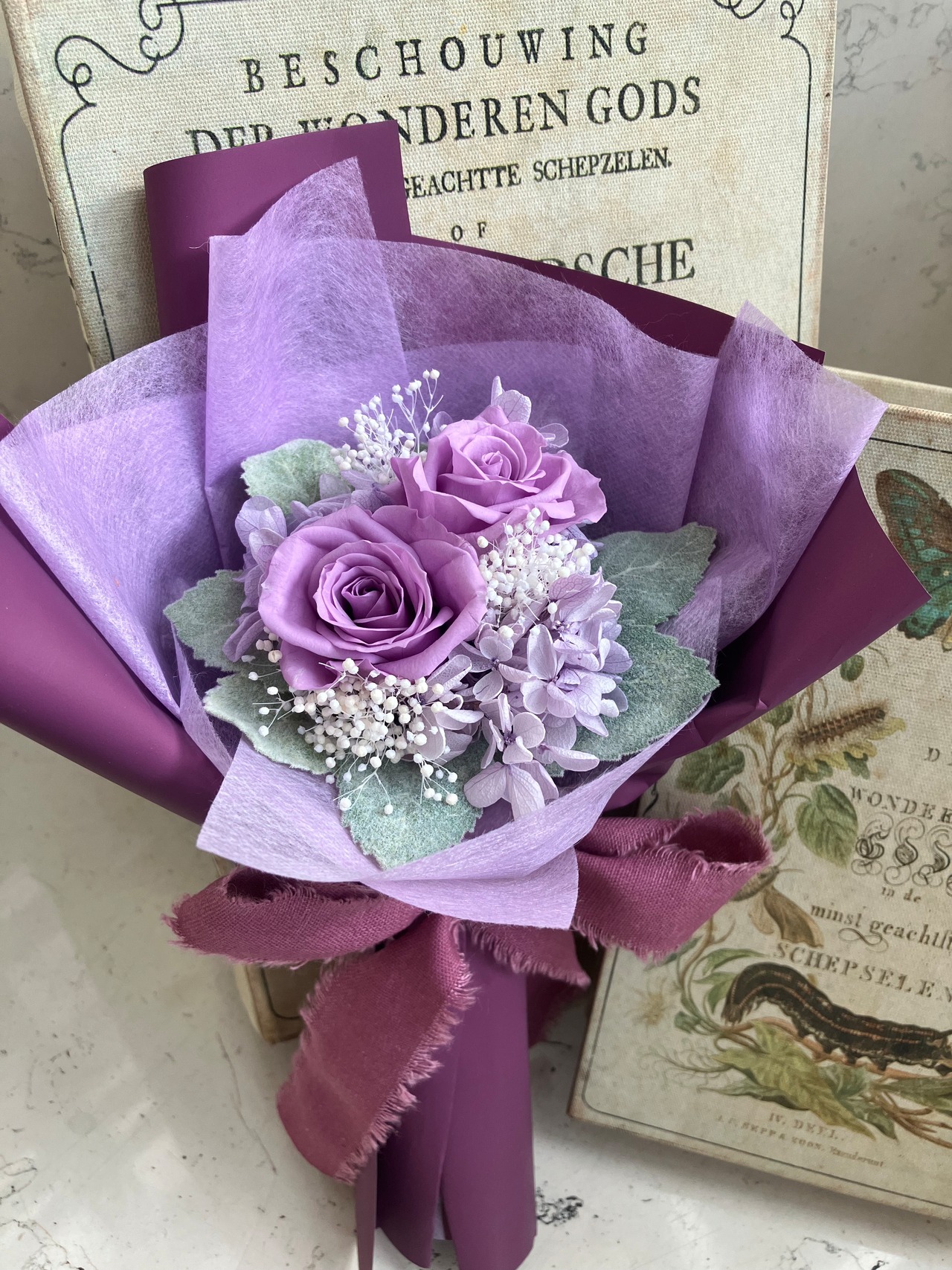 パープルのバラを入れてお作りしたシックなカラーのブーケタイプのプリザーブドフラワー。