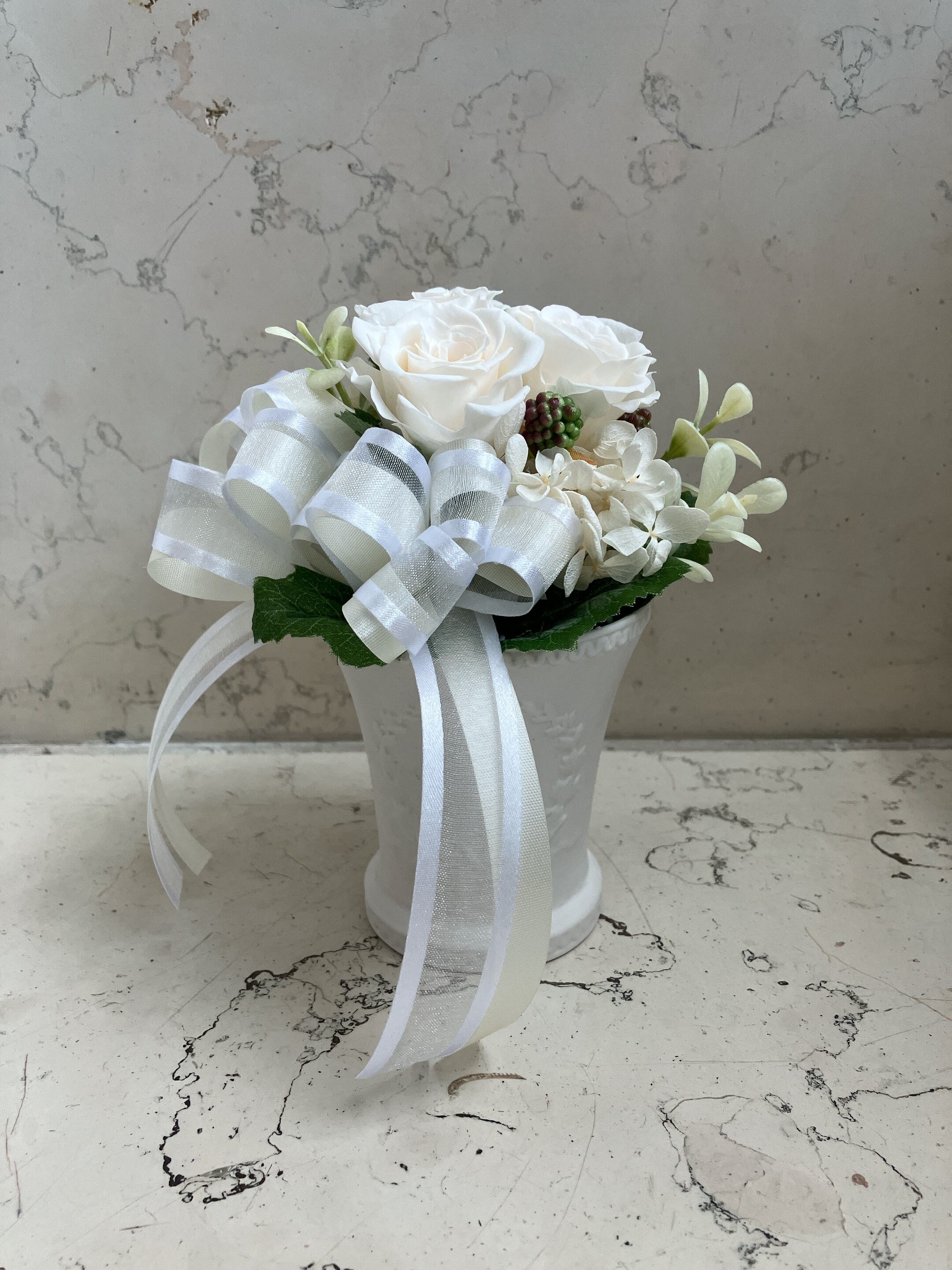ホワイトのカラーでまとめたアレンジメント。当店でも人気のシンプルなカラーです。ウエディングのお祝いギフトとしても人気です。