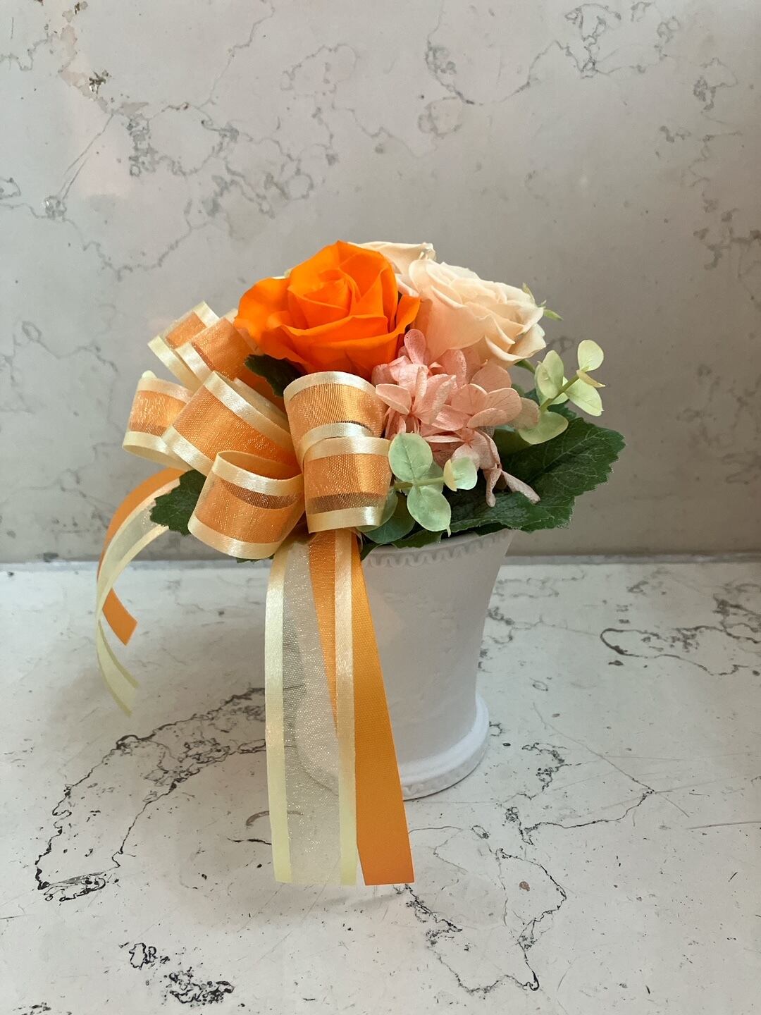 白の陶器にオレンジ色のプリザーブドフラワーをあしらった、明るく華やかなアレンジメント。プレゼントにおすすめです。