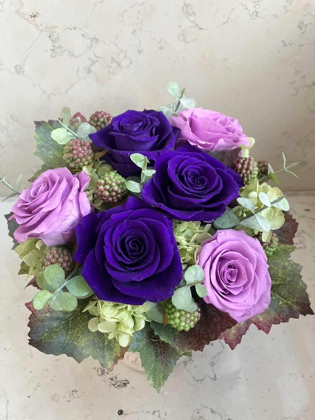 白いかわいらしいフォルムの陶器に、ムラサキ系のプリザーブドフラワーをあしらった落ち着いた色合いのアレンジメント。プレゼントにもおすすめです。