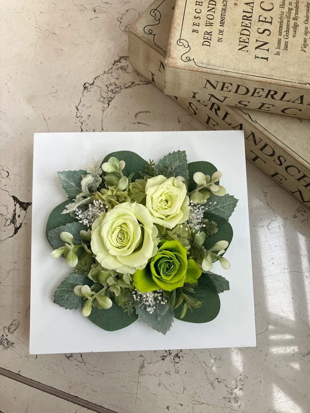 グリーンのプリザーブドフラワーをあしらった、人気のアレンジメント。