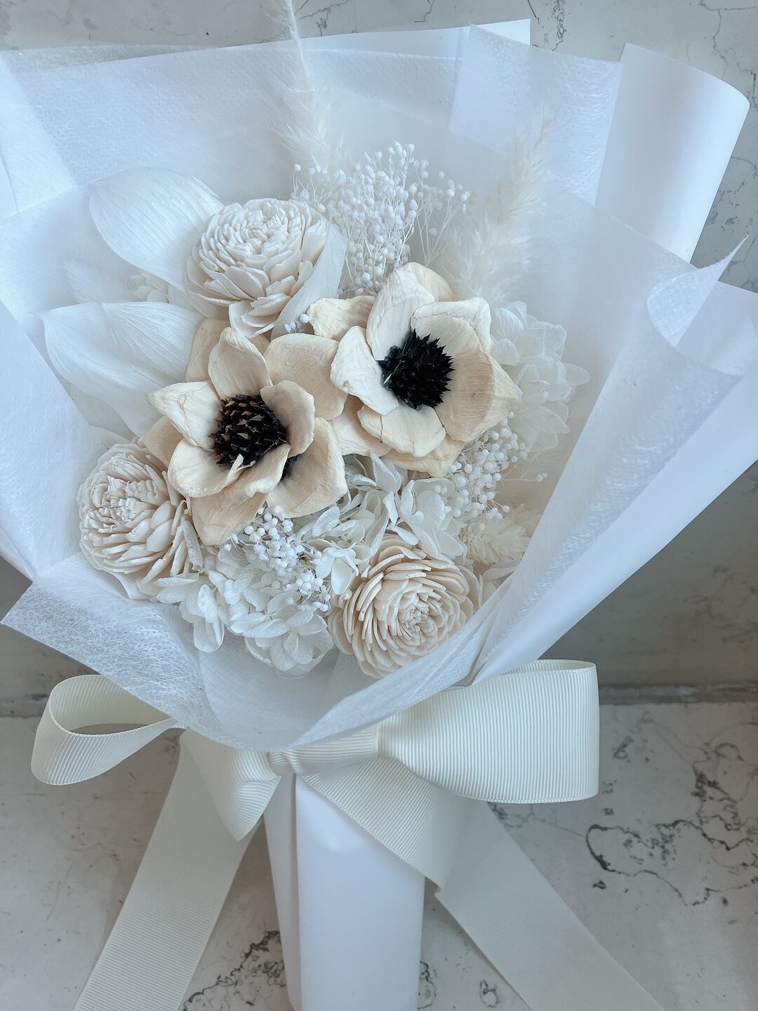 ドライフラワーやプリザーブドフラワーなどを組み合わせてお作りしたブーケです。